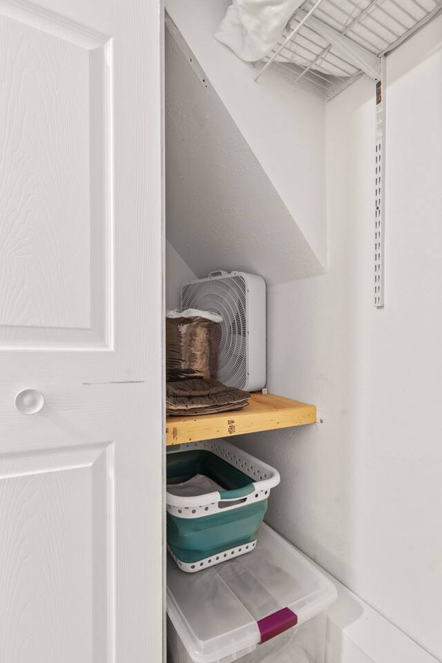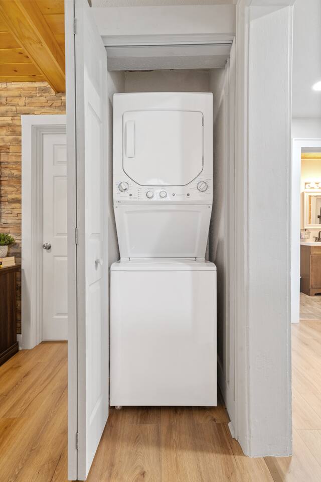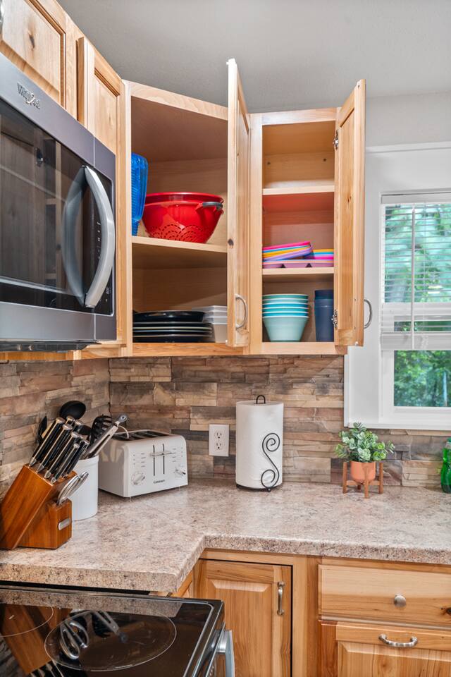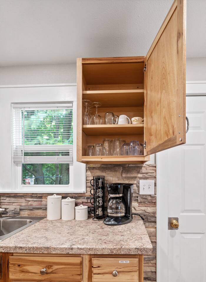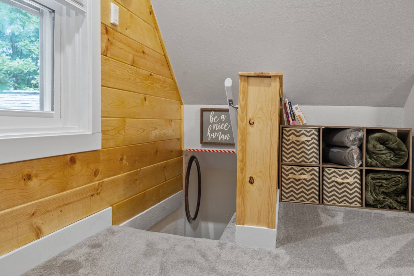 The main level bedroom is a full bed. There are two Twin XL beds upstairs in the loft area. Please note the short ceiling on the stairs.