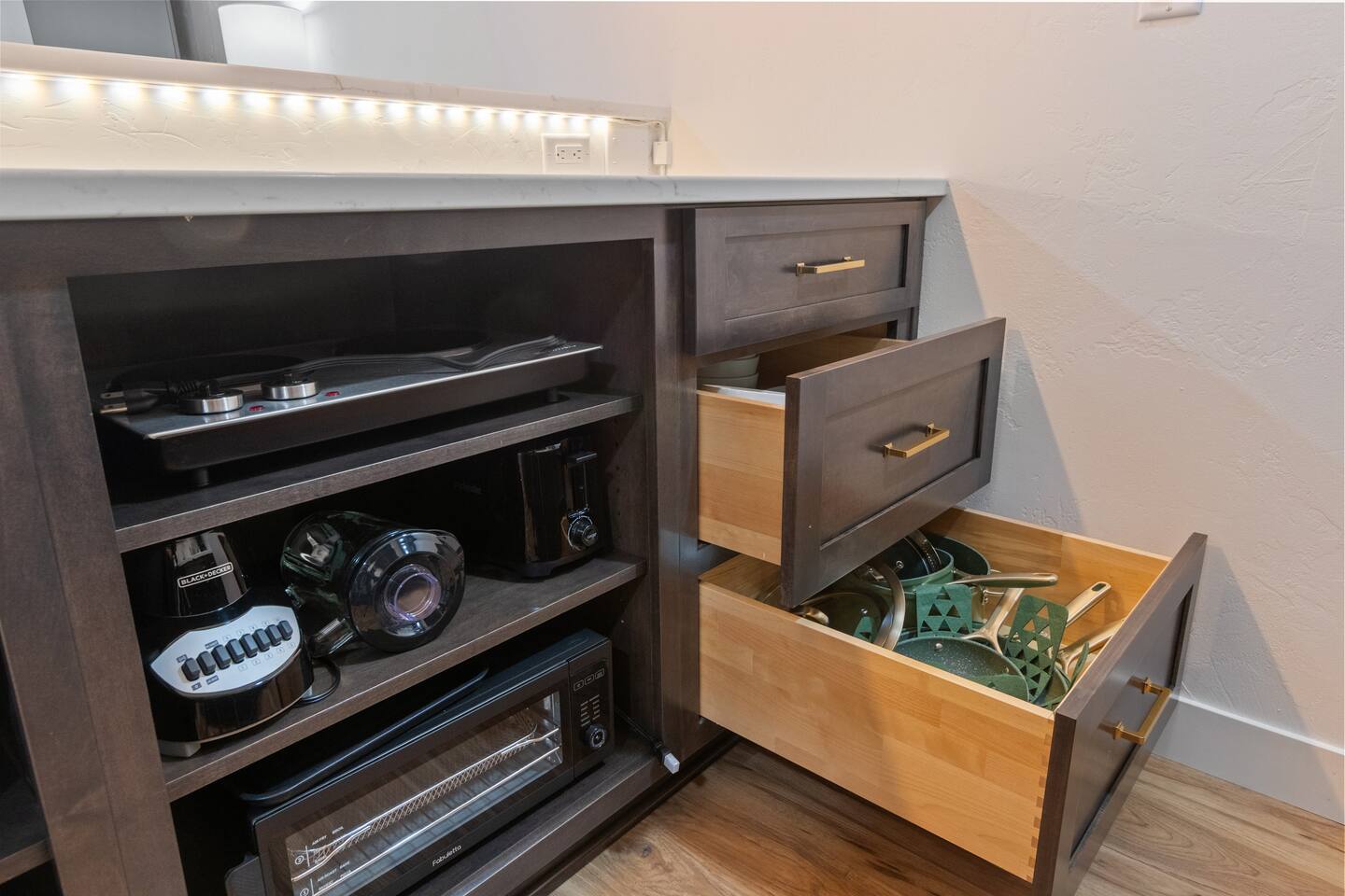 The grill is located on the back patio, and grill utensils are located in the kitchen. Please clean the grill after use. A $25 fee will be applied if the cleaning team needs to clean the grill, as this is not part of their routine house cleaning.