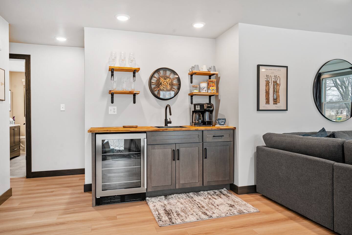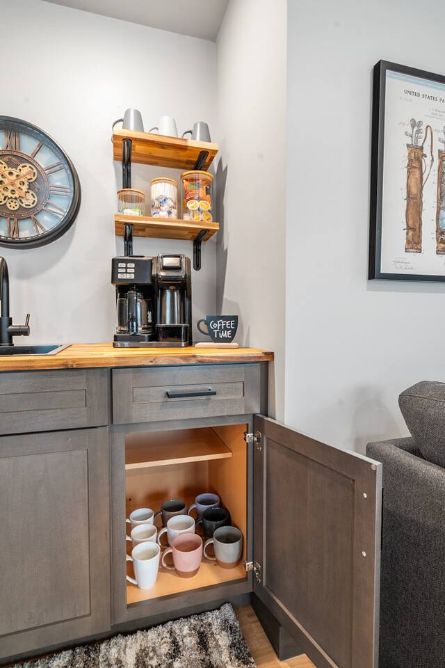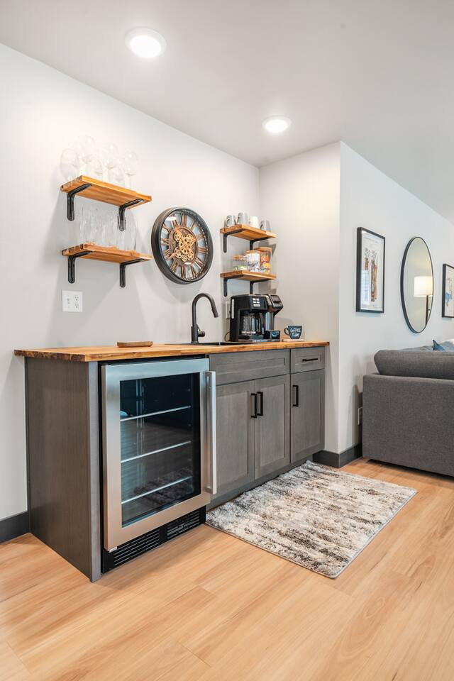 Open concept living room, dining room, kitchen with a center island and wet bar area with a mini refrigerator. Smart tv where you can stream your services or watch local tv with included TV antenna.