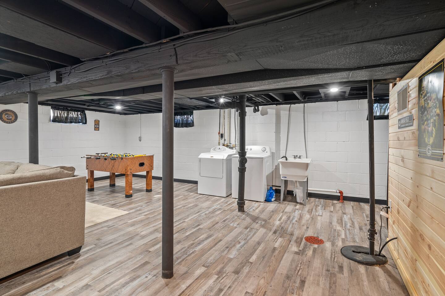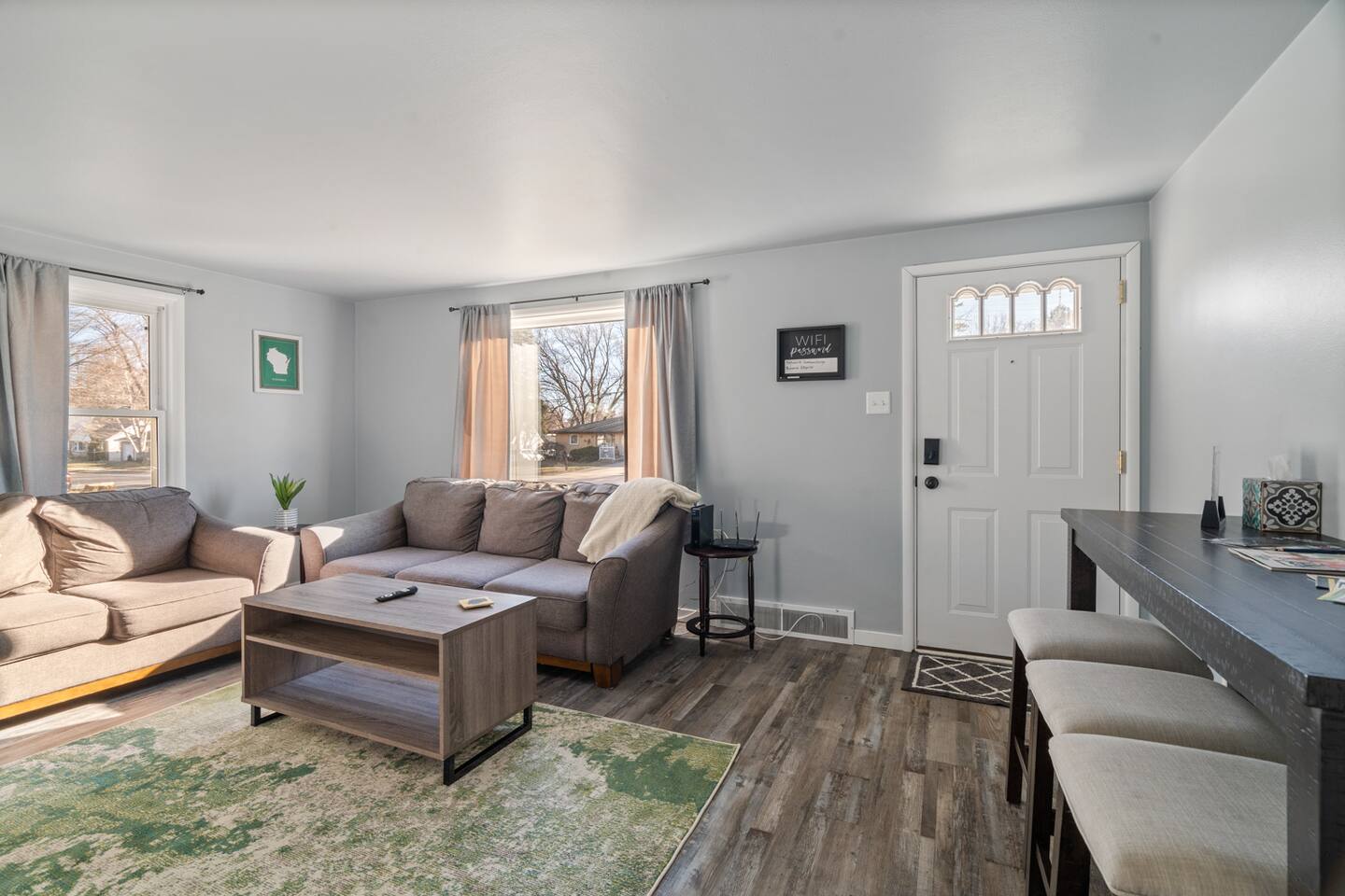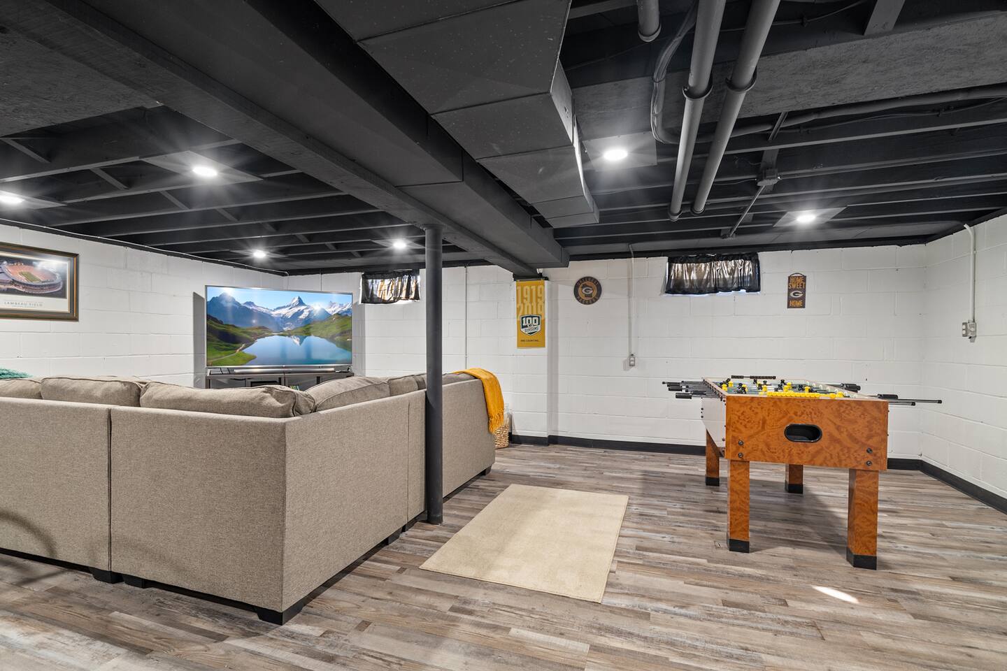 "Welcome to our inviting home just a short distance from Lambeau. This modern and conveniently located house is the ideal choice for your stay. The living room features ample seating and a large TV. Fully equipped kitchen has a modern, open layout. There are 3 spacious bedrooms. Relax in the backyard or enjoy the fantastic area downstairs for pre and post-game activities. The house is close to the Titletown District, restaurants, and shops, making it easy for you to explore local attractions."