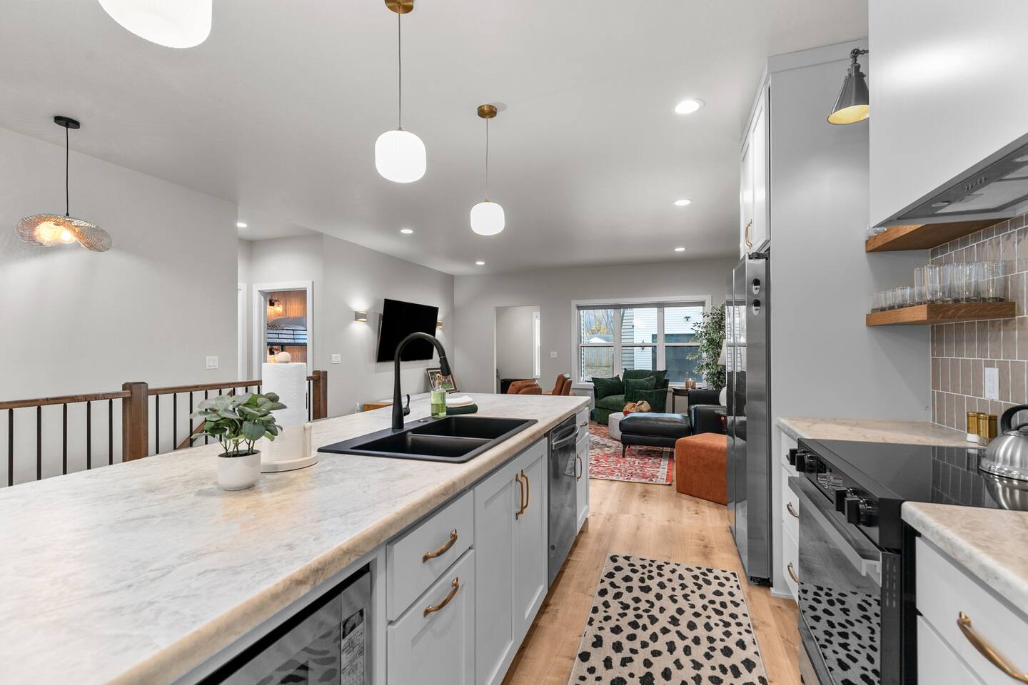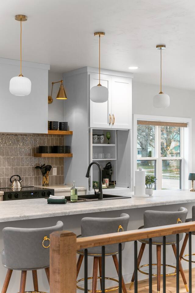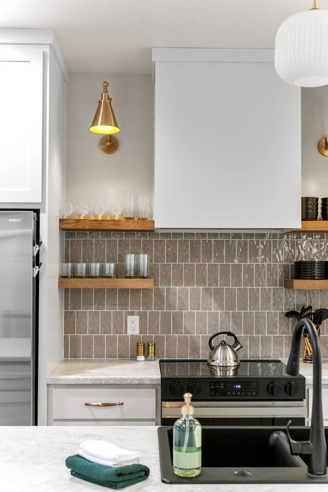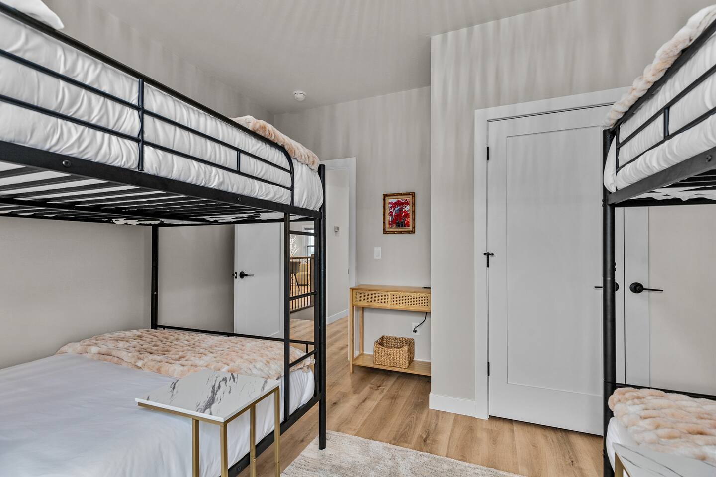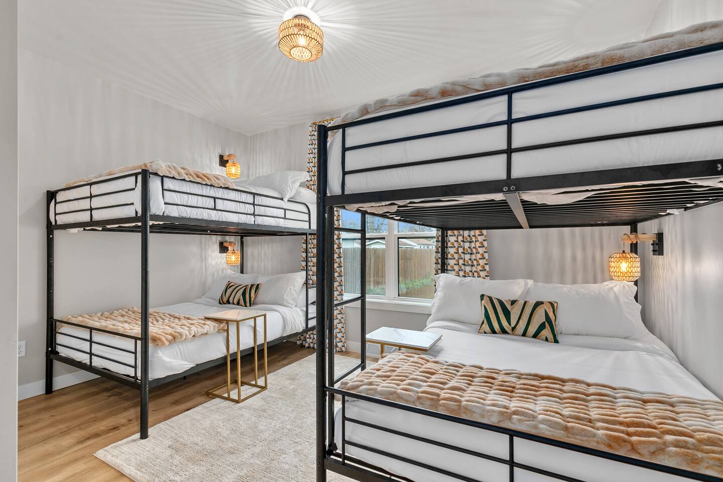 Bedroom 1: King bed with memory foam mattress. Pack n' play available for use during stay. Bedroom 2: Two full over full bunk beds Includes room darkening shades, extra blankets and pillows stocked in each bedroom. (2) Full bathroom with a shower. Gas BBQ Grill Roof Top Dining Deck over Garage with Beautiful View Fully stocked kitchen. 75" Smart TV A 12 cup coffee maker and Keurig are available. Laundry on site in Basement.