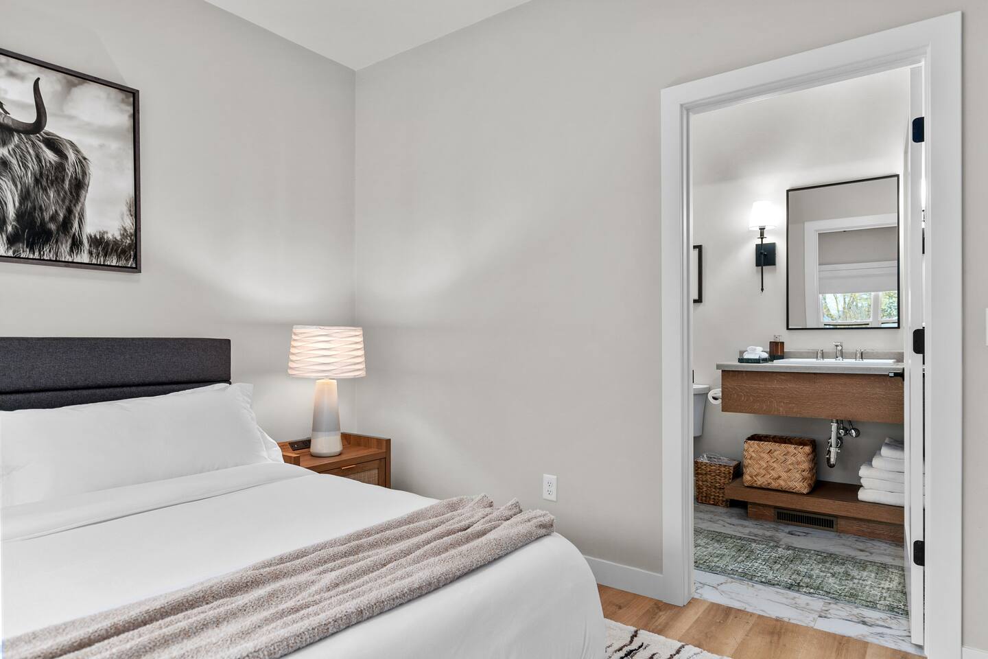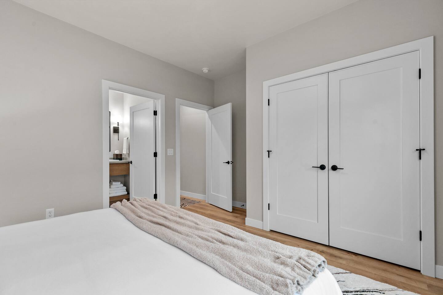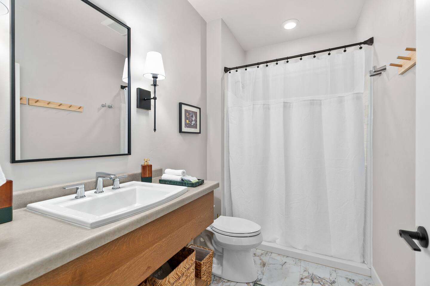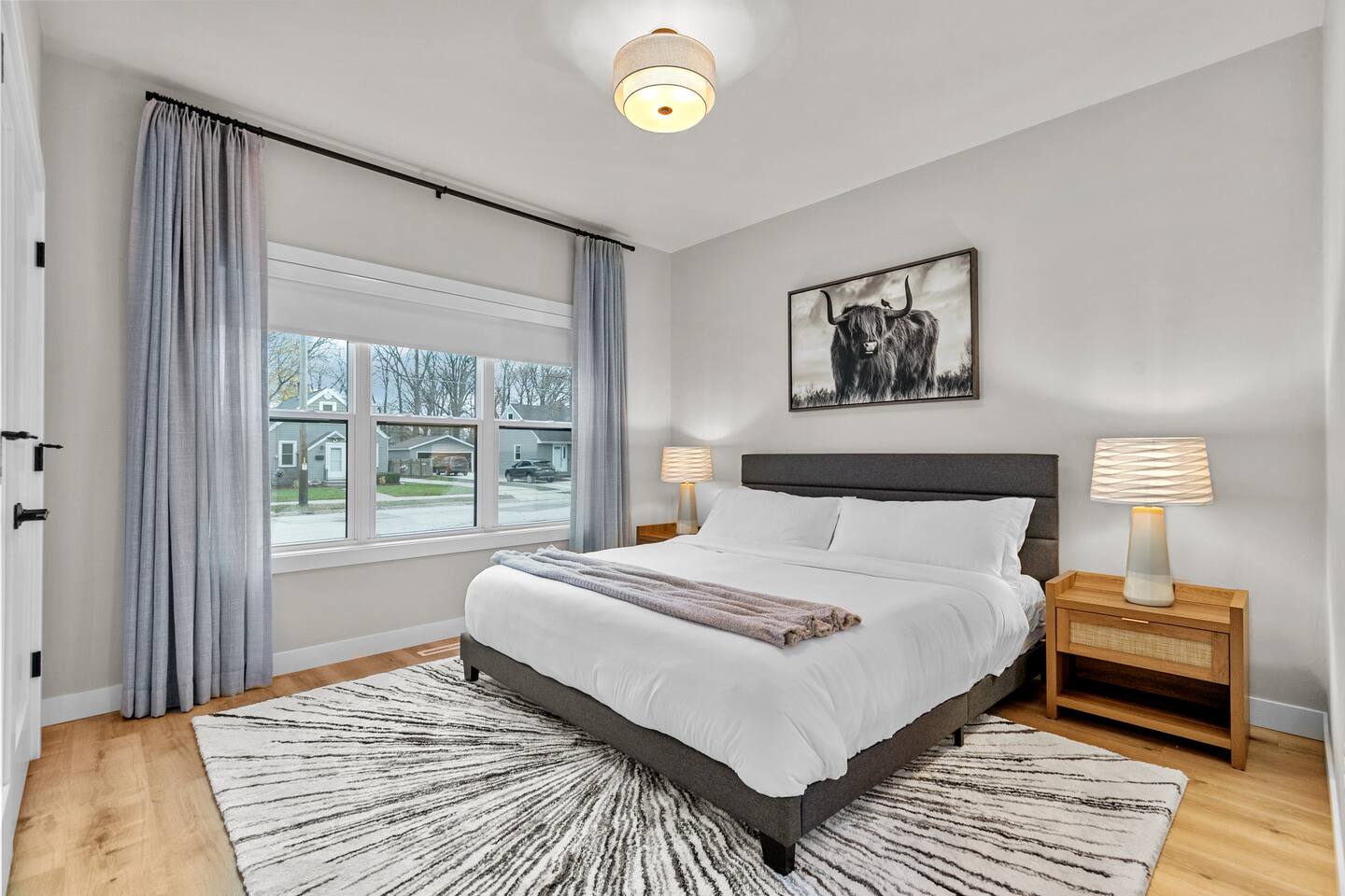 Bedroom 1: King bed with memory foam mattress. Pack n' play available for use during stay. Bedroom 2: Two full over full bunk beds Includes room darkening shades, extra blankets and pillows stocked in each bedroom. (2) Full bathroom with a shower. Gas BBQ Grill Roof Top Dining Deck over Garage with Beautiful View Fully stocked kitchen. 75" Smart TV A 12 cup coffee maker and Keurig are available. Laundry on site in Basement.